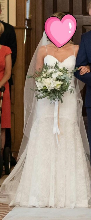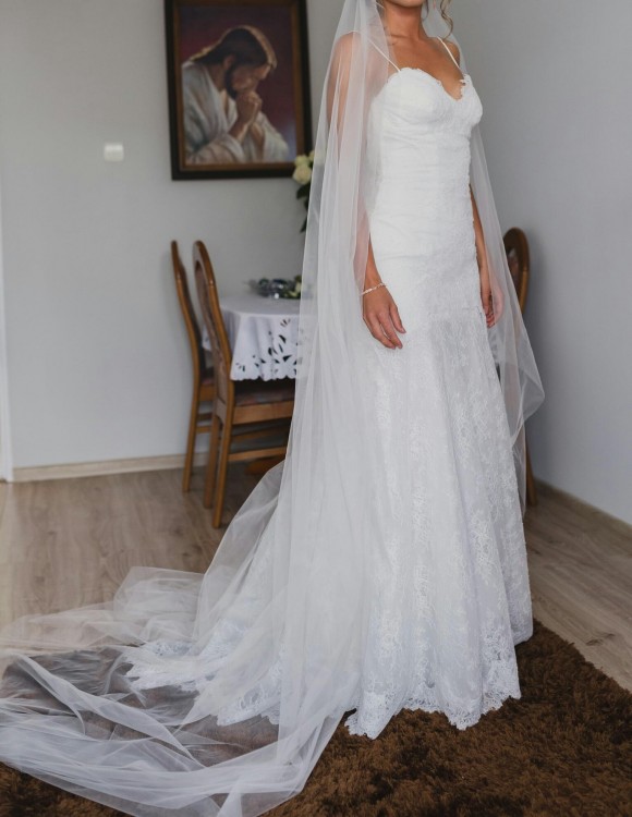 Sprzedam piękną koronkową suknię ślubną z trenem, kupioną w salonie Cymbeline Paris.