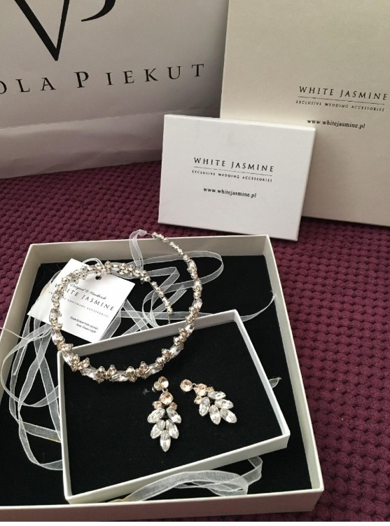 Dodatkowo mam do sprzedania opaskę i kolczyki, wykonane z takich samych kryształków Swarovskiego, jakimi wysadzona jest suknia. Biżuteria (White Jasmin) założona wyłącznie na wesele i sesję.