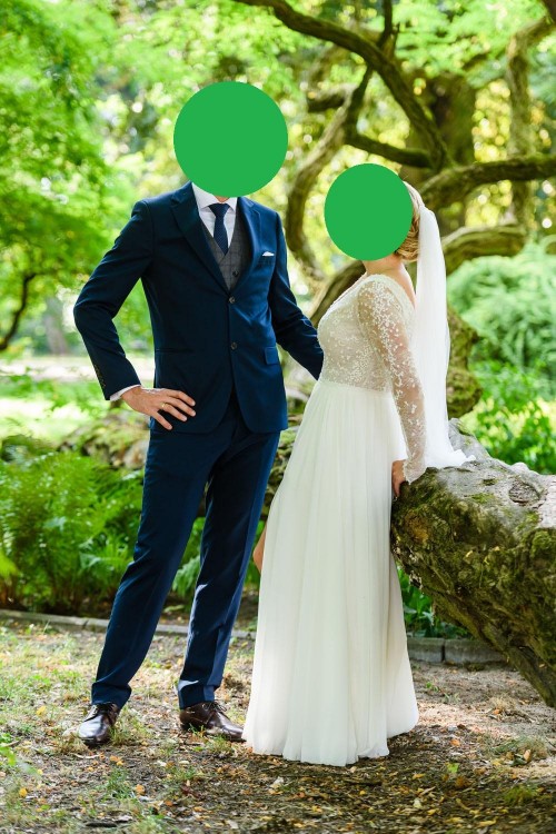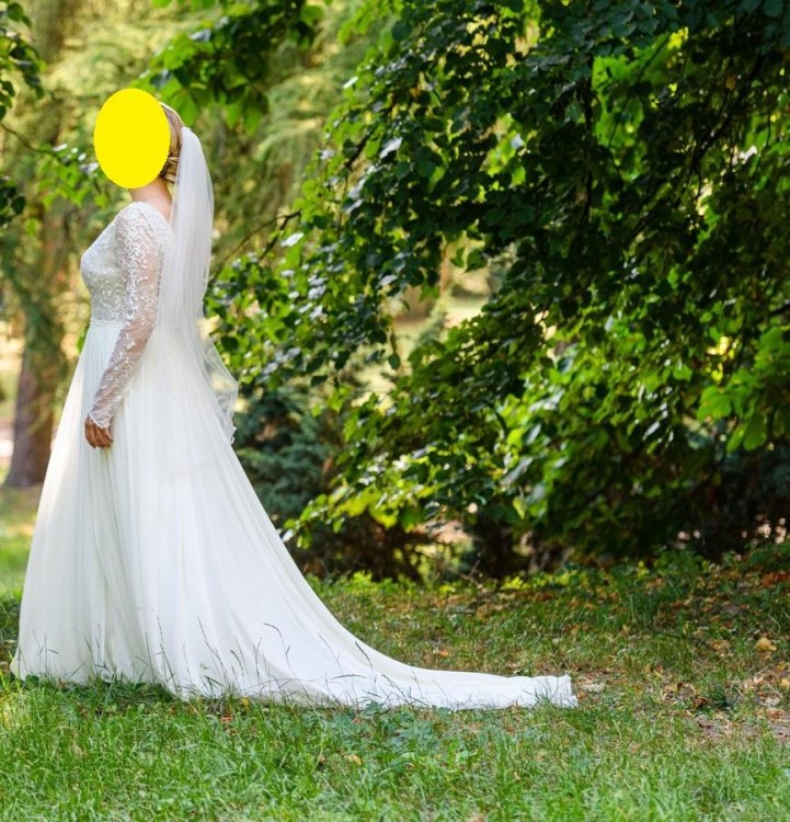Nadeszła chwila rozstania się moją piękną, jedyną, wymarzoną .... suknią ślubną. Daisy, bo tak nazywa się ten model, uszyta została w rozmiarze 36/38, z tym że na większy biust; wzrost 163 cm plus 7 cm obcas. Kolor śmietankowa biel + cielista baza na tułowiu. W odróżnieniu od oryginalnego projektu sukni (http://violapiekut.com/pl/kolekcje-slubne/2018/63_daisy) tył i przód wycięty w V. Suknia ma piękny tren zapinany na guzik (skrzętnie ukryty paseczkiem), plisy na części spódnicowej, które wysmuklają sylwetkę oraz piękne wycięcie (rozporek) na środku (z przodu), pozwalające fajnie eksponować nogi. Suknia posiada oryginalnie wszyte haftki do zaczepienia ramiączek i tyłu biustonosza (na ramionach i na plecach), tak by nie wychodził (sprawdziły się na weselu i na sesji). Suknia wykonana została ze zwiewnego lekkiego materiału. Już podczas przymiarek czułam, że odróżnieniu od innych sukienek które mierzyłam, ta suknia będzie bardzo wygodna i tak też było. Jest lekka i fajnie się układa w czasie chodzenia i tańca. Część koronkowa sukni, zakończenia rękawów i dekoltu wysadzone są kryształkami Swarovskiego. Suknia uszyta w salonie Violi Piekut. Polecam ją dla kobiet, które nie skarżą się na mały biust ;)