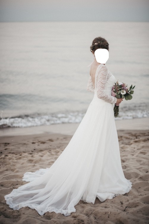 Sprzedam piękną suknię ślubną Maggie Sottero Deirdre z kolekcji 2017 zakupioną w salonie w Szczecinie. Idealnie wpisuje się w obecny trend rustykalny i boho. Wykonana jest z koronki i szyfonu z Santorini. Ma długi koronkowy rękaw, odkryte plecy, gorsetowe usztywnienie. Posiada przepiękny tren zakończony koronką (podpinany). Elegancka, bardzo kobieca i oryginalna-nieustające komplementy gwarantowane!
