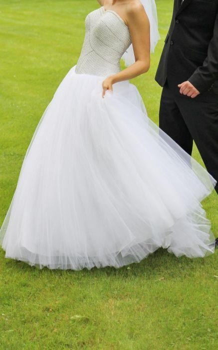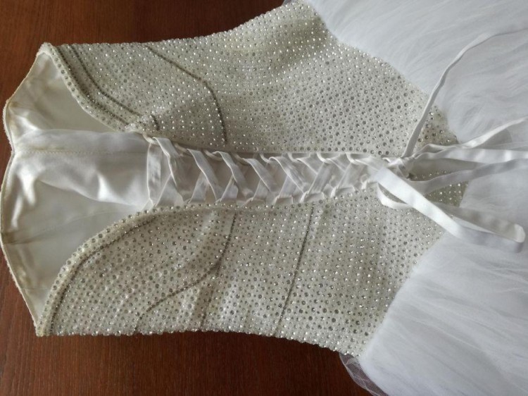 Miejscami na gorsecie od wewnętrznej strony lekkie ubrudzenia z pudru i są w 100% zmywalne. Koraliki, które sie odlaczyly wystarczy dokleić lub przyszyc. Jedna warstwa tiulu lekko przedarta u spodu- wystarczy usunąć i suknia będzie wyglądać pięknie. Także jako krótka będzie sie dobrze prezentować. Dołączam także oryginalny futerał.
