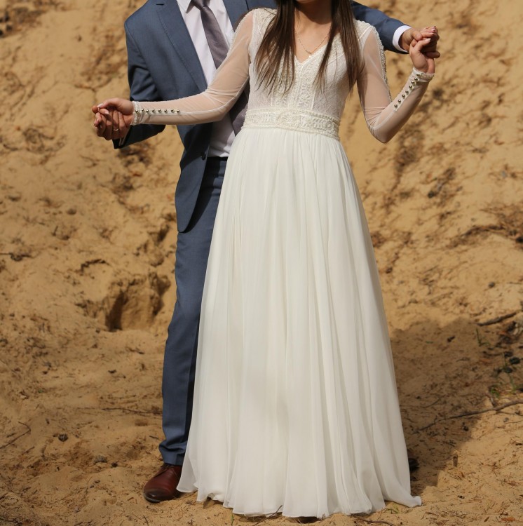Góra sukni uszyta z koronki, zdobiona koralikami, na plecach dekolt w kształcie litery V. Dół sukni uszyty z muślinu, który pięknie układa się w tańcu.
