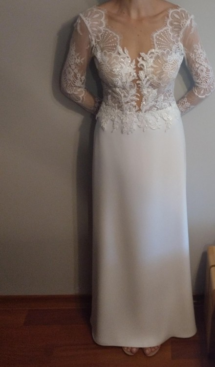 Suknia ślubna w rozm. 34/36. Na wzrost 164 cm + 7,5 obcas, kolor ivory. Model Diana Soho ze zmienionym dołem. Założona 2 razy, w bardzo dobrym stanie. W razie zainteresowania mogę przesłać więcej zdjęć i informacji.