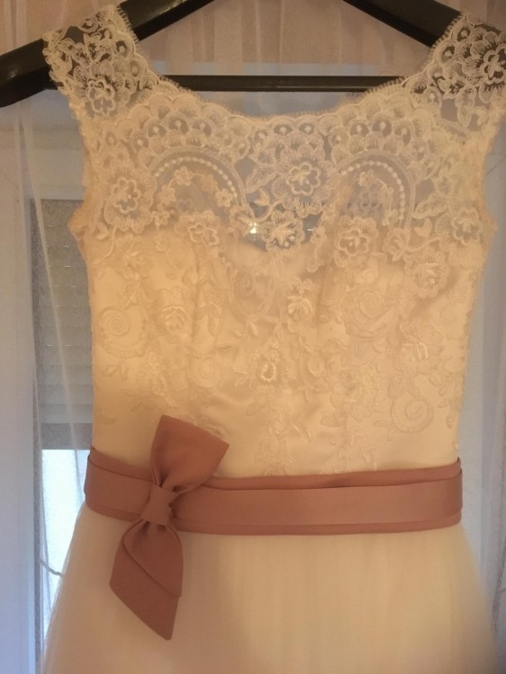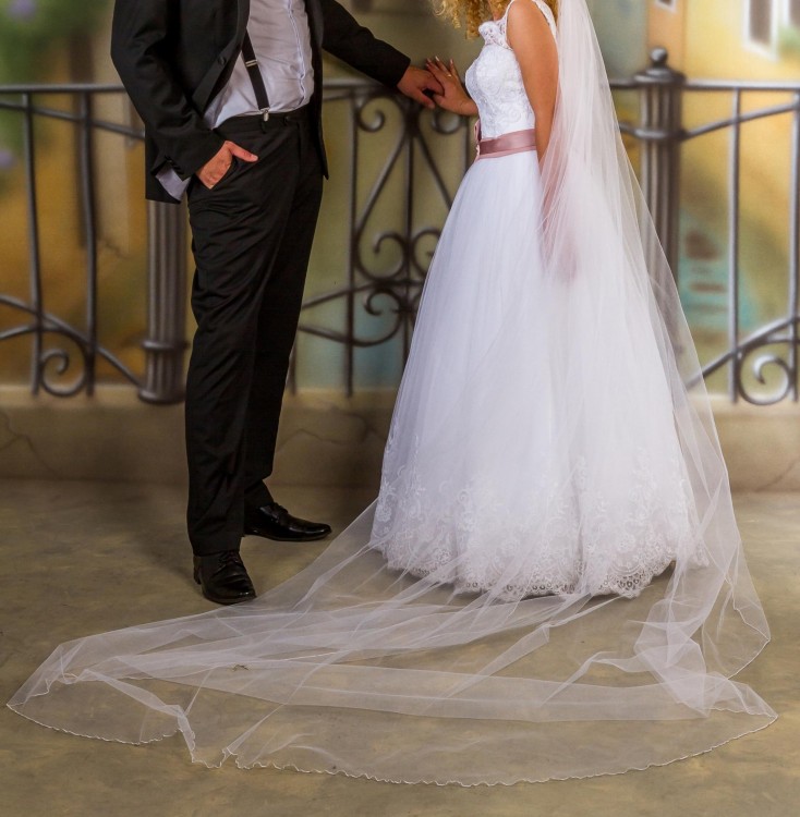 Suknię zdobi piękny pasek zakończony kokardą w kolorze brudnego różu, co nadaje sukni wyjątkowości. Oczywiście pasek to dodatkowy element nie trzeba go zakładać. Do suknie dwa welony – długi, który idealnie nadaje się do uroczystości zaślubin i krótki do zabawy weselnej.