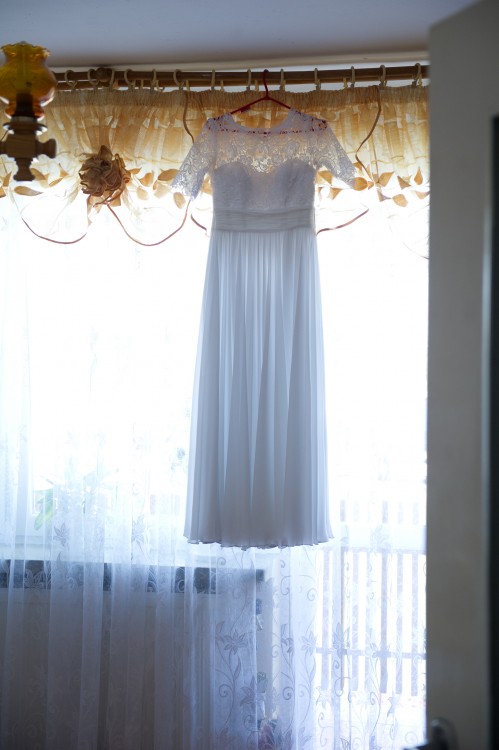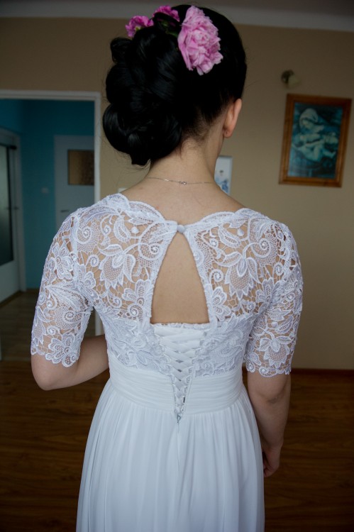 Góra sukni uszyta jest z koronki(gipiury). Z tyłu suwak oraz wiązanie umożliwiające dopasowanie sukni do każdej sylwetki. Sukienka posiada efektowne rozcięcie z przodu.
