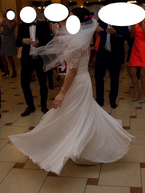 Dół sukni wykonany jest ze zwiewnego muślinu, który pięknie układa się w czasie tańca.