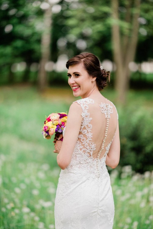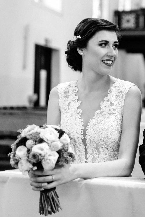 Suknia w kolorze écru posiada pięknie zdobioną koronkową górę, wykonaną z gipiury. Tył to efektowne głębokie wycięcie zabudowane cielistą siateczką i perełkami wzdłuż kręgosłupa. Długi, lekki tren po ceremonii ślubnej może zostać szybko i dyskretnie podpięty na guziczek poniżej pośladków, dzięki czemu nie przeszkadza w tańcu. Sukienka wykonana z koronki francuskiej podszytej tkaniną z lycry wykończona na dole gipiurą, dół jest dopasowany w okolicach bioder i lekko rozszerzający się ku dołowi co eksponuje kobiece kształty. Suknia bardzo wygodna, dobrze układająca się na ciele. Lekka, nie ogranicza ruchów w tańcu.