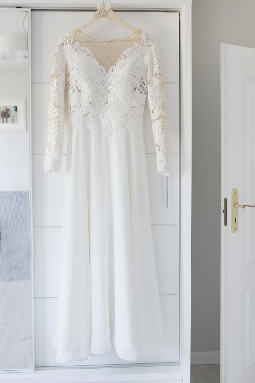 Góra sukni z gipiury połączona z połyskującą koronką.