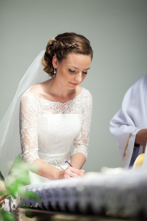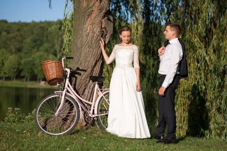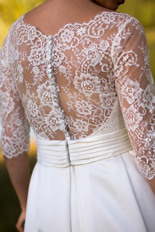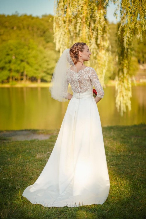 Suknia jest w kolorze ecru. Posiada tren, który można podwiązać. Na plecach koronka i prześliczne zapięcie w formie drobnych guziczków. Dół wykonany jest z lejącej satyny. Suknia ma też kieszenie, które nie rzucają się w oczy, a są bardzo przydatne w tym ważnym dniu.