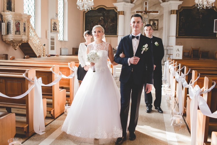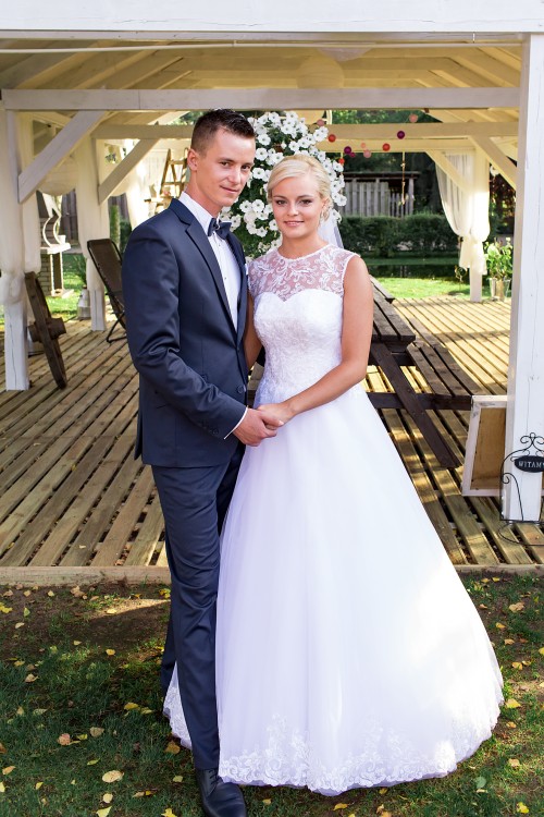 Suknia z kolekcji 2017 rozmiaru 36, miseczka C, szyta na wzrost 160 cm + obcas 10 cm. Suknia w kolorze czystej bieli z pięknym motywem tatuażu na plecach. Suknia na żywo wygląda o wiele lepiej niż na zdjęciach, gdyż na gorsecie są mieniące się drobinki, które dodają blasku tej sukni. Do sukni mam jeszcze białe buty rozmiaru 36. W gratisie dorzucam welon, również z tego samego salonu i tej samej kolekcji, cena za jaką go kupiłam to 250 zł.
