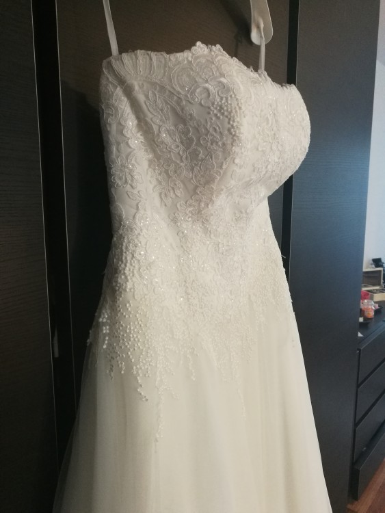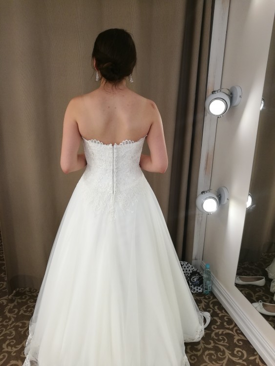 Klasyczna i bardzo elegancka bez trenu, ze zdobionym gorsetem, wykonana z lekkiego tiulu wykończona na dole koronką. Suknia nie krępuje ruchów, dodatkowo do sukni załączam także zakupioną halkę na kole, która umożliwia komfortowe poruszanie się i dzięki temu suknia jest bardzo wygodna i wyjątkowo lekka. Spokojnie umożliwia przetańczenie w niej całej nocy nie bojąc się o jej uszkodzenie. Suknia zapinana jest od wewnątrz na regulowany pas, która dopasowuje gorset do ciała i utrzymuje suknie na swoim miejscu od zewnątrz suknia zapinana jest na zamek i delikatne guziczki. W trakcie przyjęcia i zabawy nie opadała i górna warstwa tiulu przepięknie wirowała w tańcu. Suknia została wyprana w profesjonalnej pralni specjalizującej się w czyszczeniu sukni ślubnych.