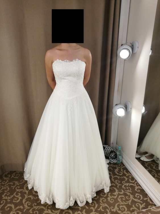 Klasyczna i bardzo elegancka bez trenu, ze zdobionym gorsetem, wykonana z lekkiego tiulu wykończona na dole koronką. Suknia nie krępuje ruchów, dodatkowo do sukni załączam także zakupioną halkę na kole, która umożliwia komfortowe poruszanie się i dzięki temu suknia jest bardzo wygodna i wyjątkowo lekka. Spokojnie umożliwia przetańczenie w niej całej nocy nie bojąc się o jej uszkodzenie. Suknia zapinana jest od wewnątrz na regulowany pas, która dopasowuje gorset do ciała i utrzymuje suknie na swoim miejscu od zewnątrz suknia zapinana jest na zamek i delikatne guziczki. W trakcie przyjęcia i zabawy nie opadała i górna warstwa tiulu przepięknie wirowała w tańcu. Suknia została wyprana w profesjonalnej pralni specjalizującej się w czyszczeniu sukni ślubnych.