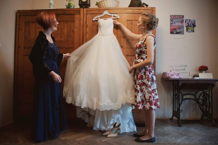 Wierzchnia warstwa sukni posiada dwie dziurki w tiulu, które bez problemu krawcowa zaszyje.