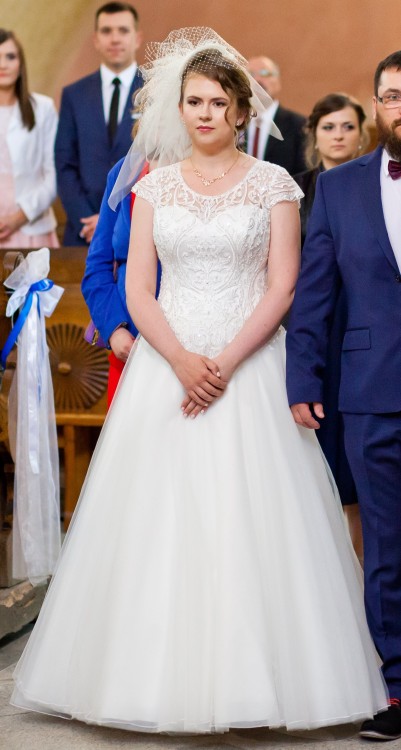 Suknia ślubna robiona na wymiar w Rzeszowie, ozdobiony piękną koronką hiszpańską podkreślającą figurę. Wymiar nietypowy!