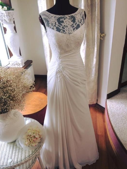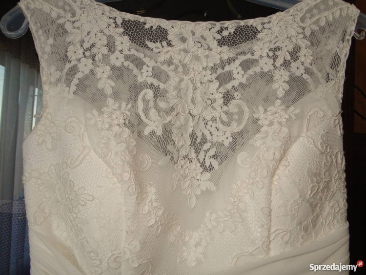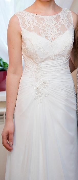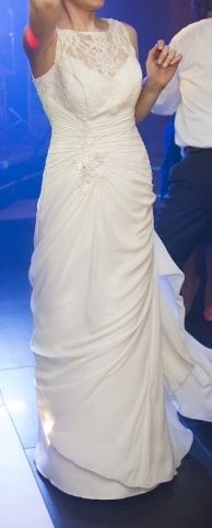 Suknia jednoczęściowa, w rozmiarze 36, na wzrost ok. 167 cm + obcas, w kolorze ecru, zapinana z boku na suwak. Dekolt i plecy wykończone prześwitującą koronką. Tren z możliwością podpięcia na niewidoczne napy.