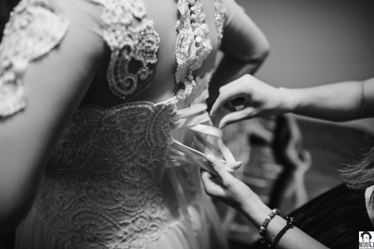 Suknia ma pięknie zdobiony perełkami gorset, który się w ogóle nie świeci, a dodaje tylko charakteru.