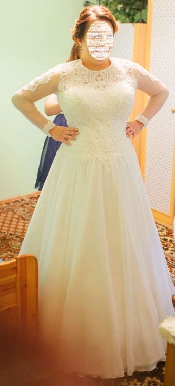 Suknia szyta na miarę, biust 112, wzrost 170, bez szpilki.Myślę, że nawet pomieści rozmiar więcej.