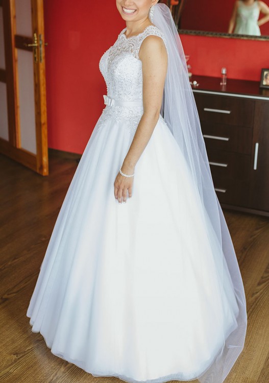 Suknia ślubna marki Elis Bridal model 17105 w kolorze białym, zakupiona w salonie ślubnym w Nysie.