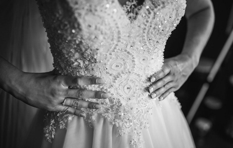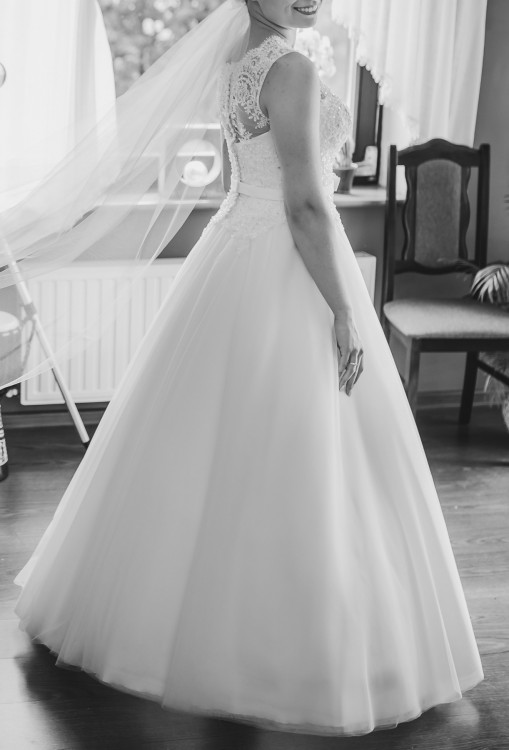 Bogato zdobiony kryształkami i koralikami gorset, zapinany z tyłu na guziczki. Do sukni dołączam halkę umocowaną na kołach, co nadaje piękny kształt sukni i sprawia, że przepięknie układa się przy chodzeniu i tańcu. Całość wypełnia odpinany pasek ze zdobioną klamerką. Suknia jest bardzo wygodna, nie tracąc przy tym swojego uroku.