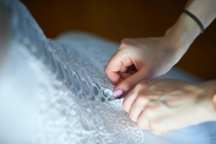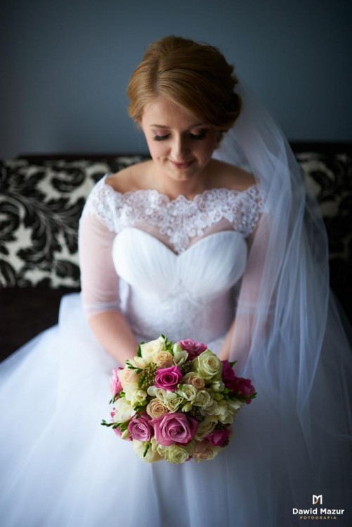 Bolerko z gipiurową koronką jest zapinane od wewnątrz sukienki na małe guziczki, dzięki czemu bluzeczka nie przesuwa się, a zarazem można z łatwością zdjąć ją w trakcie wesela.