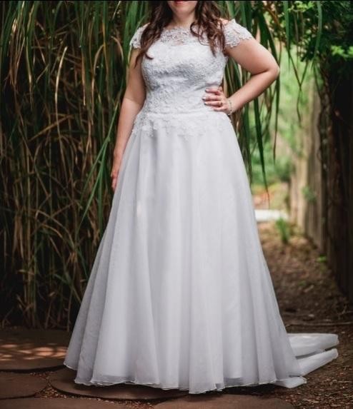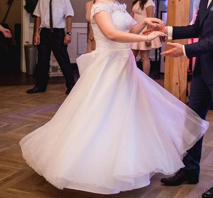 Suknia uszyta z organzy dzięki czemu jest lekka, swobodnie układa się podczas tańców i jest mega wygodna. Góra wykonana z koronkowej gipiury z odkrytymi ramionami.
