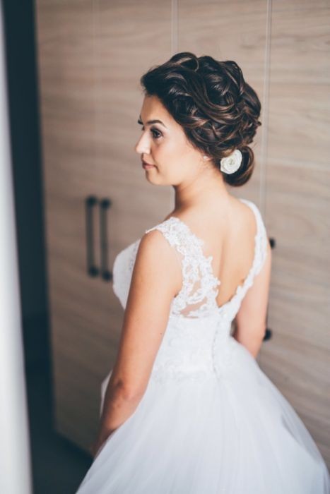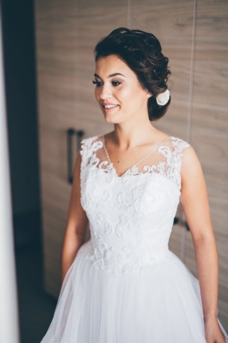 Gora sukienki wykonana z wyszywanej koralikami koronki, dol z tiulu. Posiada podpinany tren. Rozmiar górnej części w rozmiarze 34/36. Suknia szyta na wzrost 162 cm plus obcas 6 cm.