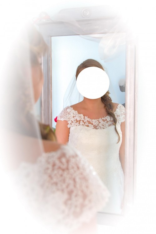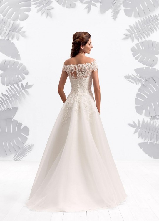Suknia Ślubna , wyszczuplający fason , bogato zdobiona góra , koronkowy tył .