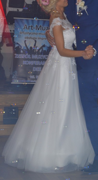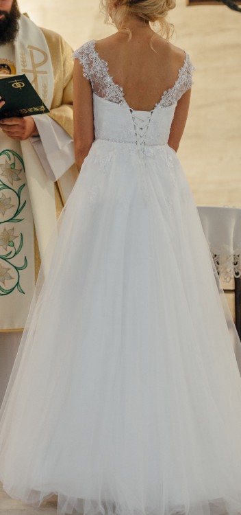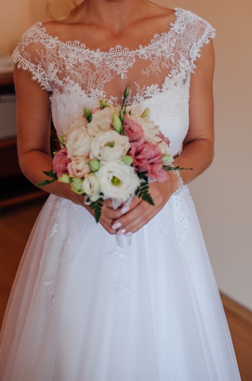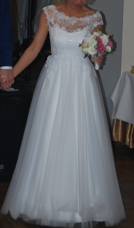 Suknia jest lekka, bardzo wygodna. Koronka na górze jest delikatna przez co praktycznie nie czuć jej na sobie. Nie "gryzie" i nie drapie. Ruchy są swobodne. Ma delikatne cekiny przez co wspaniale mieni się w słońcu.