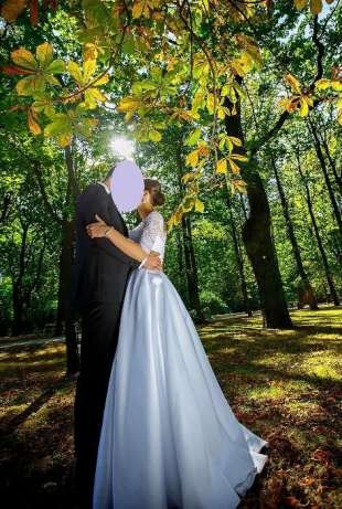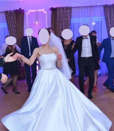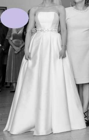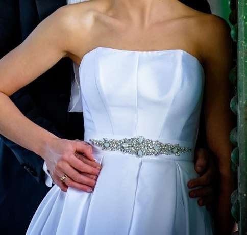 Suknia ma kontrafałady, które pięknie układają się w czasie tańca oraz posiada ukryte kieszenie. Gorset zasuwany jest na suwak. Suknia założona wyłącznie na ślub i sesję. Po każdym założeniu uprana w pralni. Stan jest idealny.