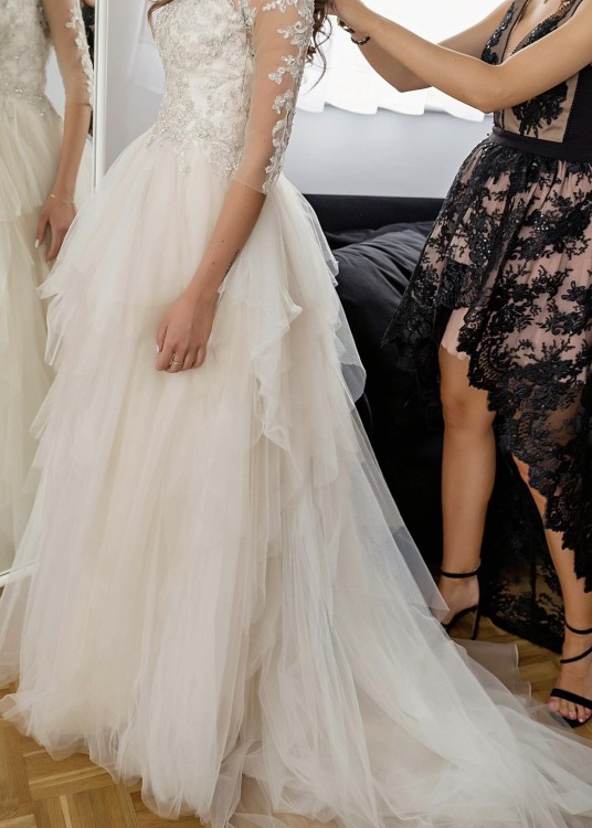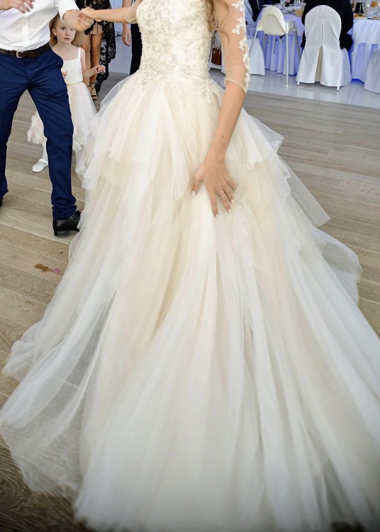 Sprzedam suknie ślubna Enzoani model Beautiful BTI7-b . Rozmiar xs-s . Zakupiona w salonie sukien ślubnych Carolina Novia w Krakowie . Suknia posiada tren podpinany na guziczki . Dół sukni wykonany z lekkiego tiulu. Jest bardzo wygodna i zwiewna. Jest po czyszczeniu, w stanie idealnym. Zapraszam