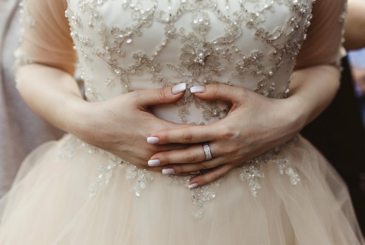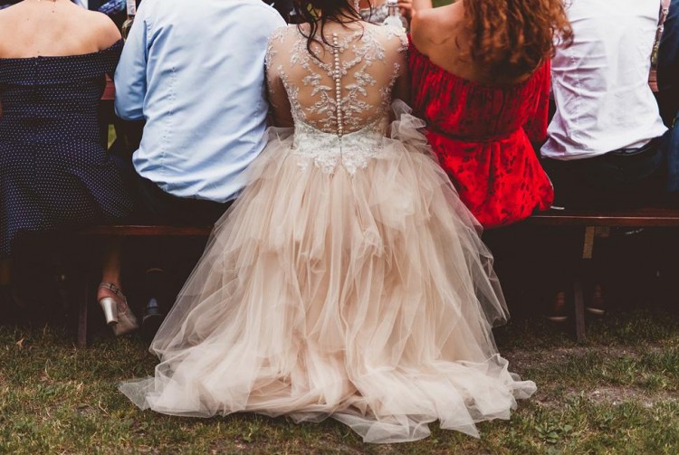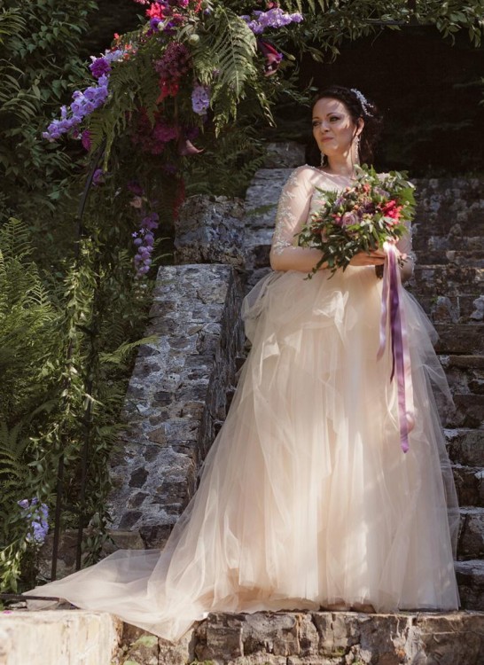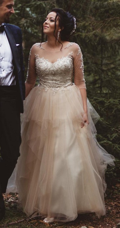 Rozmiar małe 40\ duże 38. W pasie, gdzie gorset łączy się ze spódnicą szerokość ok 38 cm. Z salonu dostałam informację, że suknia nadaje się do poszerzenia bądź zwężenia. Dopasowana do wzrostu 168 cm + 7 cm obcas. Gorset w kolorze ivory bogato zdobiony ręcznie wyszywanymi aplikacjami oraz elementami srebrnymi, transparentnymi cekinami i drobnymi perełkami. Całość na jednej warstwie siateczki w kolorze cielistym, pasującym do dołu sukni. Dekolt ukryty za siateczką. Aplikacje powtarzają się na rękawkach 3/4 oraz na plecach, przez co robi oszałamiające wrażenie, jakby aplikacje były bezpośrednio na skórze. Dół sukni to spódnica w kolorze ivory z dodatkową warstwą tiulu w tym samym kolorze. Na to kaskadami spływają kolejne warstwy tiulu różnej długości w kolorze blush - łososiowym\morelowym. Suknia posiada rozkładany i podpinany tren. Zapinana na guziczki.