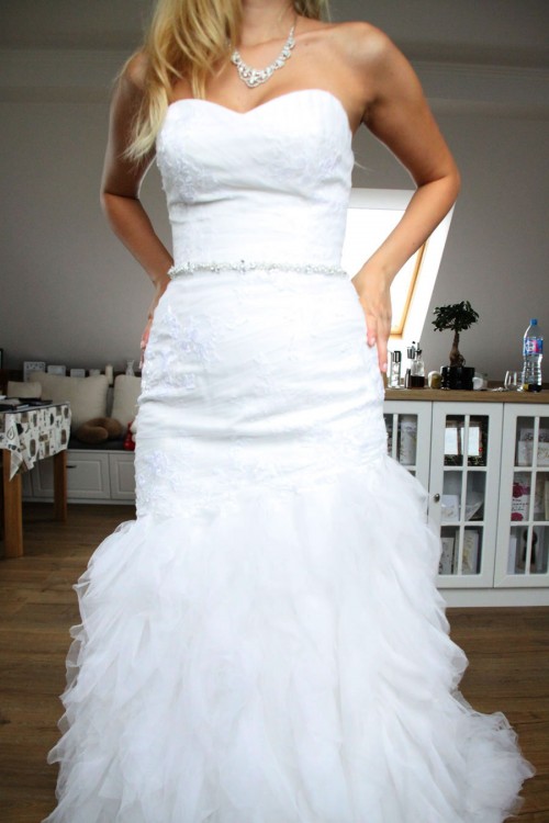 Suknia przepięknie podkreśla talie, linie bioder oraz pupę.