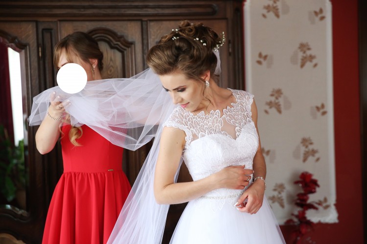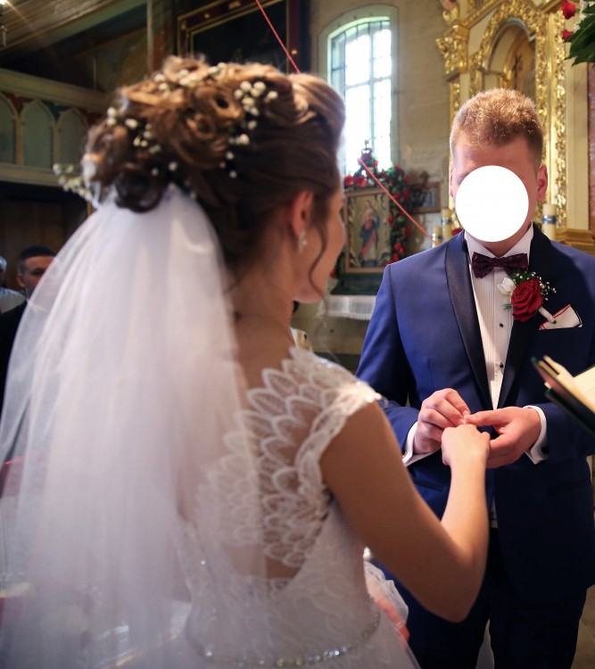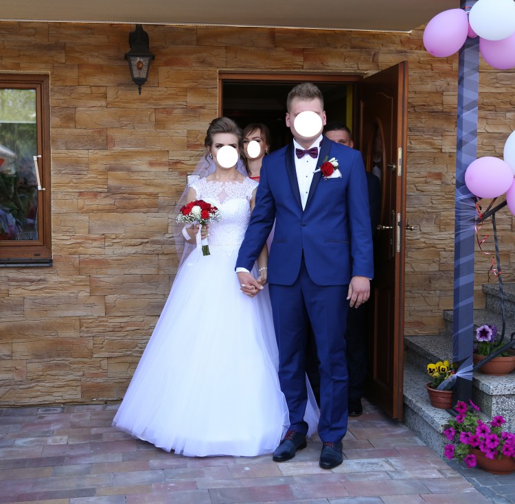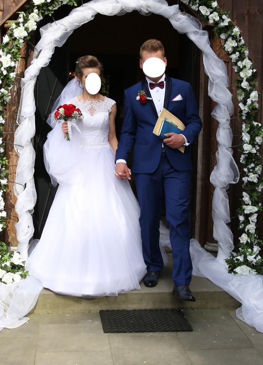 Witam, posiadam na sprzedaż przepiękną suknię ślubną, model Ester. Suknia została kupiona przeze mnie w tym roku, jestem jej pierwszą właścicielką. Suknia posiada koronkową górę, jest to wzór listków, które ułożone są w jednym kierunku- ku górze. Wzmacniana linia gorsetowa świetnie trzyma i dopasowuje suknię do sylwetki. Suknia w pasie posiada srebrne cyrkonie, które nadają blasku i elegancji sukni. Zza linii cyrkonii wyłaniają się pasma koronki, które idealnie wtapiają się w lekki tiul. Dół sukni składa się z trzech warstw tiulu, który jest wyjątkowo lekki i delikatny w dotyku. Suknia może być noszona na dwa sposoby- z kołem, bądź bez niego. Wart uwagi jest tył sukni, gdzie koronka układa się w skrzydła. Suknia zapinana na guziczki. Jest to suknia uszyta z materiałów najwyższej jakości.