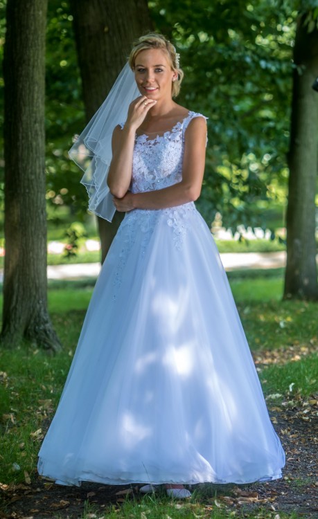 Sprzedam suknię ślubną firmy Estera model Sharimall kupioną w czerwcu 2018 roku. Sukienka szyta była na miarę w jednym z jeleniogórskich salonów sukien ślubnych. Sukienka elegancka, skromna, lekka i wygodna. Zakładana dwukrotnie (dzien ślubu + sesja), w stanie idealnym, góra to koszulka wzbogacona o grube, haftowane wzory kwiatów oraz kamyczki, które pięknie się mienią dodając blasku Pani Młodej. Haftowany wzór delikatnie przechodzi na dół sukni, który układa się w delikatną literę "A". Suknia zapinana jest na zamek oraz 28 guziczków, które niewątpliwie dodają uroku. Dekold "w łódeczkę". Suknia posiada delikatny tren, który można podpiąć na specjalnie przystosowany do tego guziczek, dzięki czemu tren zupełnie się chowa, nie przeszkadzając np. w tańcu (wersja z rozłożonym i upiętym trenem na zdjęciach). Sukienka szyta w rozmiarze 36/38, wysokość 176 cm z możliwością skracania. Zachęcam i zapraszam do oglądania :)