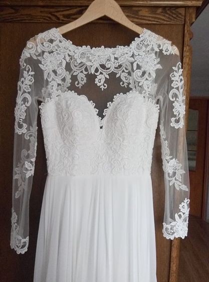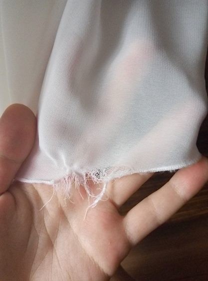 Jeśli chodzi o to uszkodzenie, to powstało w ekstremalnych warunkach plenerowych, natomiast suknia jest jakościowo bardzo porządna i podczas wesela materiał wytrzymał wszystko.