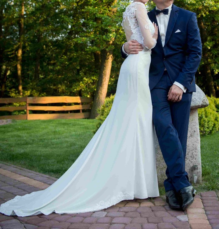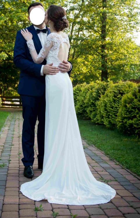 Dół z dodatkiem jedwabiu i elestanu, co sprawia, że się nie gniecie, pięknie układa i dyskretnie podkreśla figurę. Suknia ma również podpinany tren.