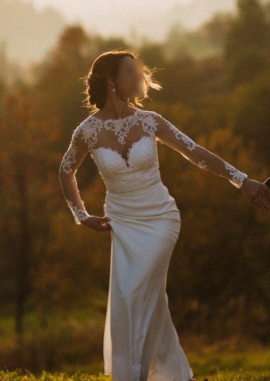 Stan dobry - założona raz na przyjęcie weselne + mini sesję w trakcie wesela. Suknia wymaga niewielkiej obróbki ponieważ jest zadarcie na dole.