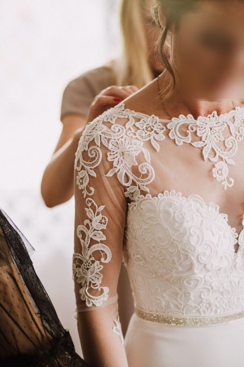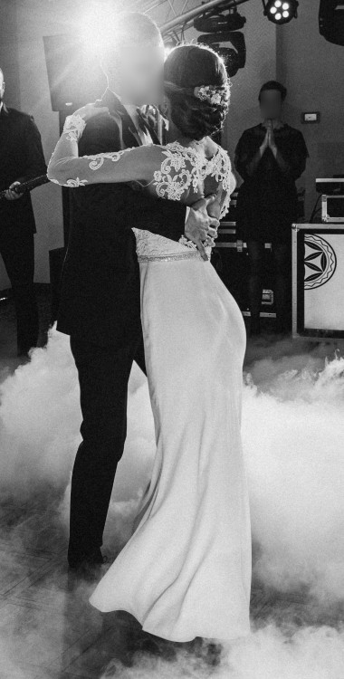 Góra sukni wykonana z jest z grubej koronki (gipiura), dół natomiast uszyty jest z muślinu z dodatkiem jedwabiu i elastanu - suknia bardzo dobrze się układa, jest lekka, wygodna i przede wszystkim doskonale podkreśla figurę. Suknia ma odcięty tren dlatego idealnie sprawdza się w tańcu.