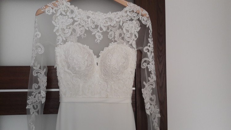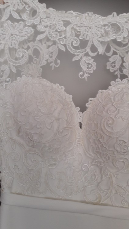 Góra sukni wykonana jest z delikatnej koronki, idealnie przylegającej do ciała. W gorset wszyte są poduszeczki push-up oraz dyskretny pasek w kolorze sukni. Dół z dodatkiem jedwabiu i elestanu, co sprawia, że się nie gniecie, pięknie układa i dyskretnie podkreśla figurę. Suknia ma również podpinany tren.