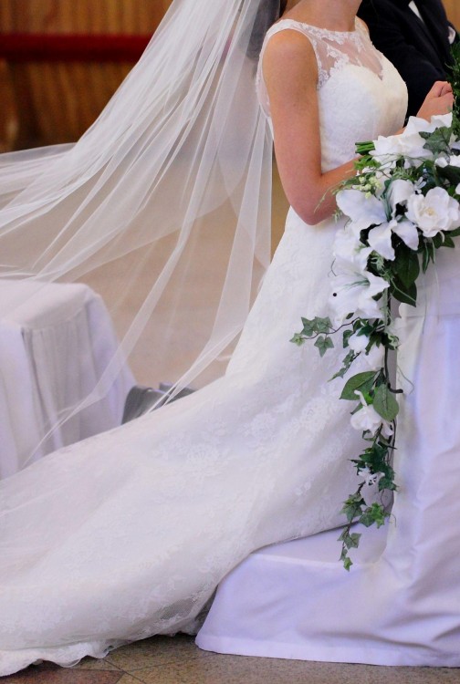 Posiada piękny, długi tren z możliwością podpięcia.