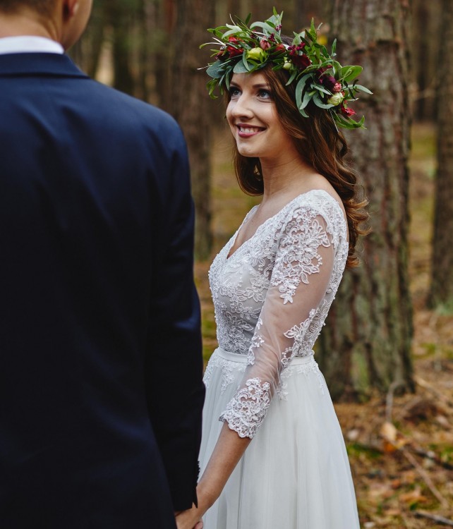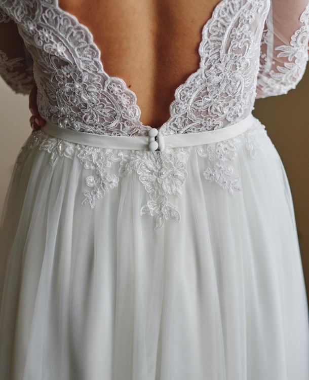 Suknia została zaprojektowana i wykonana w Polsce, zdobiona ręcznie.
