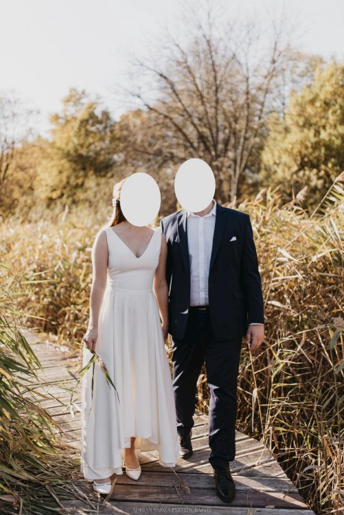 Suknia ślubna model Madeline Pik firmy Szyjemy Sukienki. Szyta na wzrost 166 cm + obcas 7 cm. Jeśli chodzi o rozmiarówkę to tak pomiędzy 36 a 38. (biust 70 C, talia 65 cm).