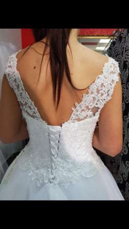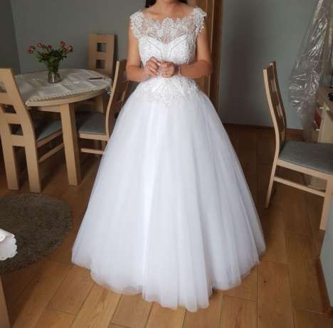 Sukienka ślubna firmy Antra model Fresia kolekcja 2017 , kolor: sniezno bialy, zakupiona w salonie slubnym Dana Witaszyczki, k. Jarocina. Kosztowala 2600zl. Suknia uszyta na rozmiar M, wzrost 163 + 9cm obcas. Suknieka na podwójnym kole, tren zapinany. Tył sukienki wiązany, przez co dopasowuje się do każdej sylwetki. Trzecia warstwa tiulu nablyszczana brokatem przez co pięknie się mieni. Góra sukienki wysadzana kamieniami oraz perelkami. Sukienka po czyszczeniu chemicznym, do poprawek krawieckich - delikatnie poszarpany tiul na dole sukienki oraz dziurka na siateczce sukienki - spowodowana czyszczeniem chemicznym, widoczne na zdjeciu. Welon wysadzany kamyczkami dorzucam gratis. Serdecznie polecam.