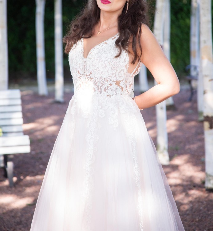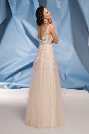 Do sprzedania suknia Glenda z salonu Fulara&Żywczyk w rozmiarze 38, uszyta na wzrost 163 cm + 7 cm obcas. Kolor - ecru/fiołkowy róż. Suknia założona 2 razy - na ślub i plener. Góra z koronki portugalskiej przeszytej mieniącymi się koralikami natomiast dół składa się z 2 warstw tiulu i jedwabnej podszewki. Bardzo dobrze układa się w tańcu, wygodna i solidnie uszyta. Cena katalogowa wynosi 4900 zł.