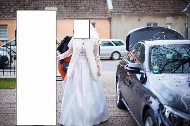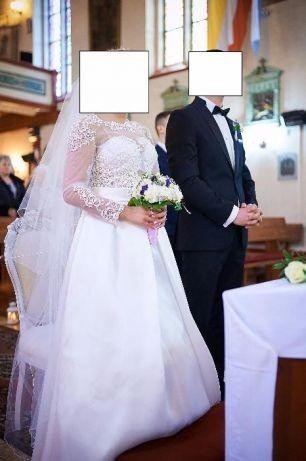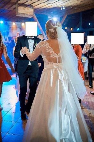 Suknia Ślubna szyta w Salonie Sukien Ślubnych 'I love CMŚ' w Szczecinie na wzór sukni od Fulara&Żywczyk z 2017r. Wprowadzone są jedynie drobne zmiany, takie jak dodanie kokardy z tyłu. Suknia jest jednoczęściowa, z górą bogato zdobiona koronką, która zakrywa biustonosz. Ma długie rękawy i subtelnie odkryte plecy. Posiadam do niej koło, które poprawia komfort chodzenia i przede wszystkim tańczenia, ale bez koła prezentuje się równie pięknie. Suknia była uszyta mniej więcej na rozmiar 38, 170 cm wzrostu + 8cm obcas, obwód piersi 75/80, miseczka C/D. Całkowity koszt uszycia sukni to 3400zł. Suknia jest odświeżona, nie posiada żadnych uszkodzeń. Do przymiarki w Szczecinie, Wałczu lub Pile. Polecam, jest piękna! :)