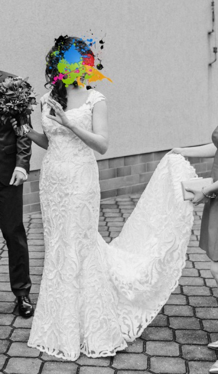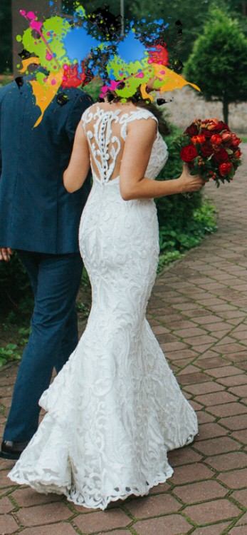 Suknia rozszerzana delikatnie od kolan z podpinanym trenem. W salonie zapłaciłam za nią 5900zł. Kolor "śmietanka". Suknia była szyta na miarę - noszę rozmiar 36/38, wzrost 164cm + obcas 9 cm (możliwość dokupienia butów w rozmiarze 36/37). Z tyłu zamek + guziczki i prześliczne zdobienia na cielistym podkładzie. Suknia bardzo wygodna, z wszytą halką, bez koła. Można bez problemu założyć biustonosz i nie trzeba go wszywać w suknię. Posiadam wszystkie dowody zakupu. Suknia w stanie bardzo dobrym - jedynym defektem jest oderwana tasiemka na dole sukni (po nadepnięciu obcasem przez inną osobę w tańcu). Suknia wyprana w pralni chemicznej.