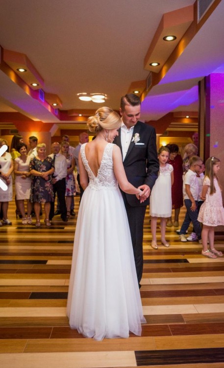 Suknia marki Gabbiano kupiona w salonie Madonna w Warszawie, szyta na wzrost 164 + 7 cm obcas, rozmiar 34/36, wszyte miseczki, kolor mleczny. Suknia jest bardzo lekka i wygodna, ma pięknie wykończoną górę, pod koronką jest cieniutka siateczka, pod pachami wycięcia, które jeszcze bardziej nadają lekkości, dół wykonany z miękkiego tiulu.