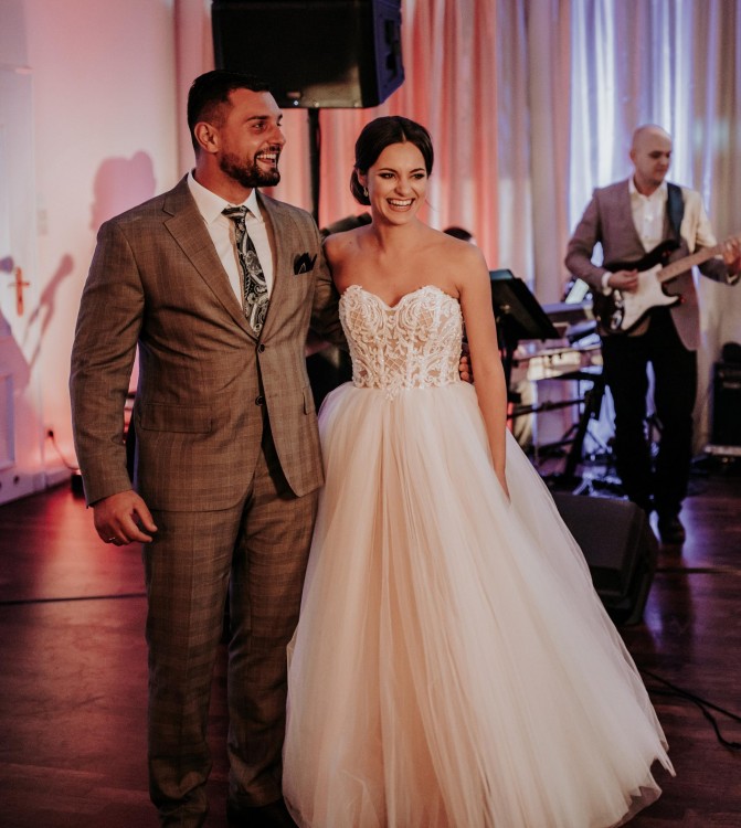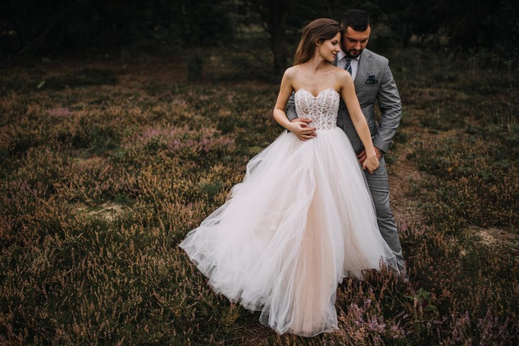 Suknia jest w klasycznym stylu princessy, uwagę przyciąga oryginalnie zdobiony gorset oraz wielowarstowy tiul z ciepłymi refleksami (spodnia warstwa jest beżowa).