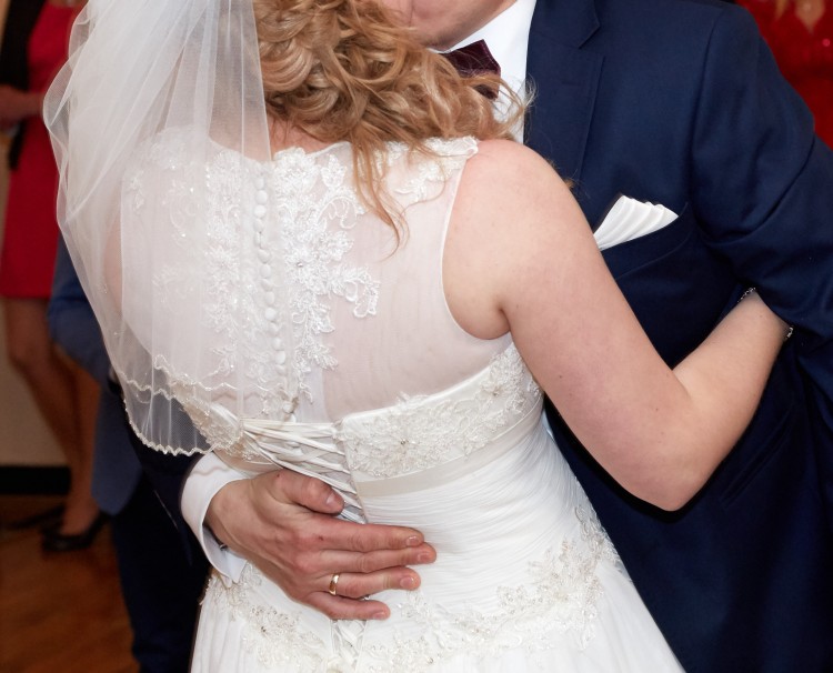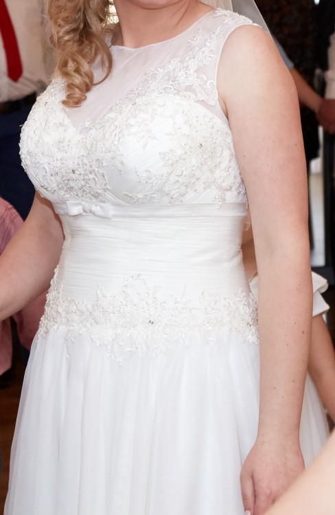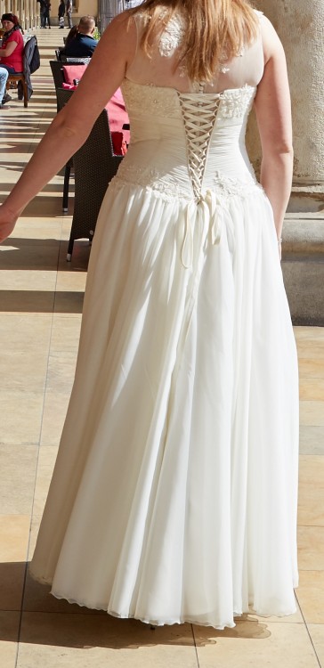 Sukienka koloru śmietanka, wiązana na gorset, który daje możliwość regulacji o kilka centymetrów w talii. Pozwala to dokonać poprawek krawieckich w większym stopniu.