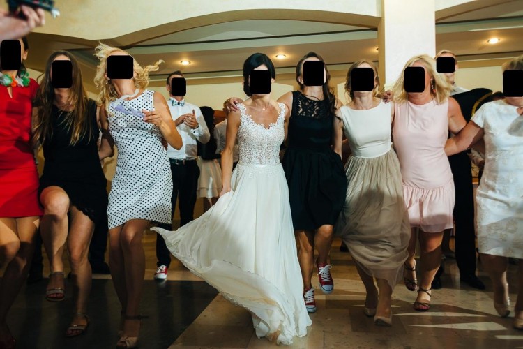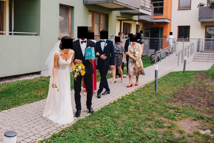 Dół sukni jest delikatny co niestety nie obeszła się bez strat (nie do nienaprawienia). Delikatna rozdarcie zostało zszyte, na szczęście dół układa się w taki sposób że jest to niewidoczne. Jeżeli ta wada podświadomie by komuś przeszkadzała można ją usunąć naprawdę małym kosztem. Wstrzymałam się z tym zabiegiem gdyż może trafić się osoba która będzie suknię skracała parę cm i problemu nie będzie:)